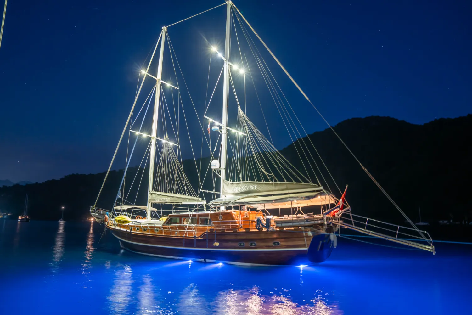 Life on board is orchestrated by a professional crew of 4, dedicated to providing impeccable service and memorable dining experiences on the covered aft deck. The yacht is designed for both relaxation and high-tech entertainment, boasting unlimited 4G/LTE Wi-Fi, a PlayStation 5, and a fully equipped coffee station for espresso and Turkish coffee lovers. For those eager to embrace the Aegean waters, Yuce Bey features an underwater lighting system for evening ambiance and a robust selection of water toys, including water skis, a Ringo, two canoes, a stand-up paddleboard (SUP), and snorkeling gear.